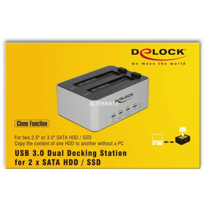 Die DeLOCK USB 3.0 Dual Dockingstation eignet sich für bis zu zwei 2,5 oder 3,5 Zoll HDDs und SSDs über die USB Schnittstelle. So benötigt man kein externes Gehäuse, da die Festplatten direkt in die Dockingstation eingesetzt werden können. Die praktische Klon-Funktion erleichtert den Transfer der Daten von einer auf die andere Festplatte und überträgt die Daten mit bis zu 480 Mbit/s Geschwindigkeit.