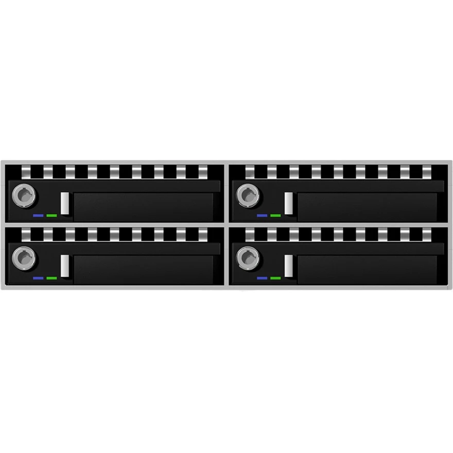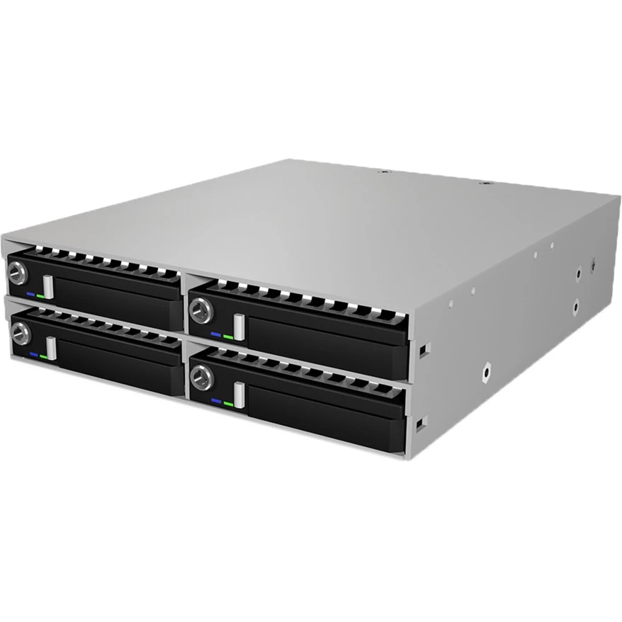 Festplatten im 2,5″-Format werden immer beliebter, auch im Serverbereich. Daher bietet ICY BOX mit der IB-2222SSK eine Backplane an, die in einen 5,25″-Schacht passt und gleich vier 2,5″-SAS- oder 2,5″-SATA-Festplatten aufnehmen kann. Die Festplattenkäfige für die 2,5″-Laufwerke lassen sich leicht entnehmen, sind abschließbar und verfügen über zwei Status-LEDs. Die Höhe der 2,5″-Laufwerke darf bis zu 15 mm betragen, für höchste Speicherkapazität und Kompatibilität. Je zwei Anschlüsse pro 2,5″-Laufwerk erlauben den Betrieb von SAS-Festplatten im Dual-Channel-Modus. Um auch für High-End-Festplatten gerüstet zu sein, arbeitet die IB-2222SSK selbst bei sehr hohem Datendurchsatz äußerst stabil und verfügt über eine entsprechend aufwendige Temperaturregelung. Das Aluminiumgehäuse kühlt bereits über den Rahmen und zwei 40-mm-Lüfter an der Rückseite sorgen für eine zuverlässige und leise aktive Kühlung der verbauten 2,5″-SAS- oder 2,5″-SATA-Festplatten.