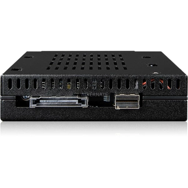 Das Icy Dock flexiDOCK MB021VP-B ist ein kompakter U.2 NVMe PCIe 3.0/4.0 SSD-Wechselrahmen, der über einen Slimline SAS (SFF-8654) Anschluss Datenübertragungsraten von bis zu 64 Gbit/s unterstützt. Er passt in den externen 3,5″ Laufwerksschacht (Floppy-Schacht) eines Computergehäuses und ermöglicht die Installation und den Austausch von Laufwerken ohne Einschub und ohne Frontklappe. Anwender können auf ihre U.2 SSD zugreifen, ohne das Computergehäuse zu öffnen oder irgendwelche Werkzeuge oder Schrauben zu verwenden. Man legt einfach eine U.2 SSD ein und betätigt die Einschalttaste, um das Laufwerk anzuschalten, und schon kann es losgehen. Dank des Designs mit offener Gerätefront können Anwender ihre U.2 NVMe SSDs innerhalb von Sekunden austauschen. Wenn ein Laufwerk in das MB021VP-B eingesetzt wird, springt die Auswurftaste des Geräts heraus. Um das Laufwerk zu entfernen, drückt man die Auswurftaste wieder hinein und das Laufwerk springt heraus. Die elegante und leicht ablesbare Status-LED ist in die Auswurftaste integriert und zeigt den aktuellen Status des Laufwerks an. Icy Dock hat einen cleveren Mechanismus zur Laufwerksführung entwickelt, der ein reibungsloses und zuverlässiges Einsetzen/Entfernen des Laufwerks ermöglicht, unabhängig davon, ob man eine U.2 SSD mit 7 mm oder 15 mm Höhe verwendet. Auf beiden Seiten des Laufwerks befinden sich zwei Führungsnocken und eine Metallklappe auf der Rückseite, die sich automatisch an die Höhe des Laufwerks anpasst. Jede der Führungsnocken klemmt das Laufwerk fest, während die anpassungsfähige Metallklappe das Laufwerk nach unten drückt, um die Stabilität des Laufwerks zu verbessern. Um die volle Leistung von U.2 NVMe PCIe 4.0×4 SSDs auszuschöpfen, verwendet das MB021VP-B einen Slimline SAS (SFF-8654) Anschluss, der Übertragungsraten von bis zu 64 Gbps unterstützt und abwärtskompatibel mit U.2 NVMe PCIe 3.0 x4 SSDs bis zu 32 Gbps ist.