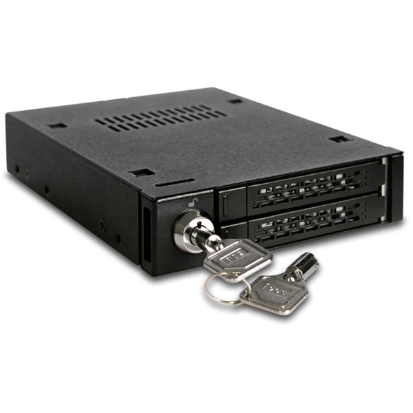 Der Wechselrahmen Icy Dock MB992SK-B kann in nur einem 3,5″-Schacht bis zu zwei 2,5″-SATA-Festplatten oder -SSDs mit einer Höhe von 9,5 mm aufnehmen. Der MB992SK-B ist abschließbar, sodass eine unbefugte Entnahme der Laufwerke verhindert werden kann.
