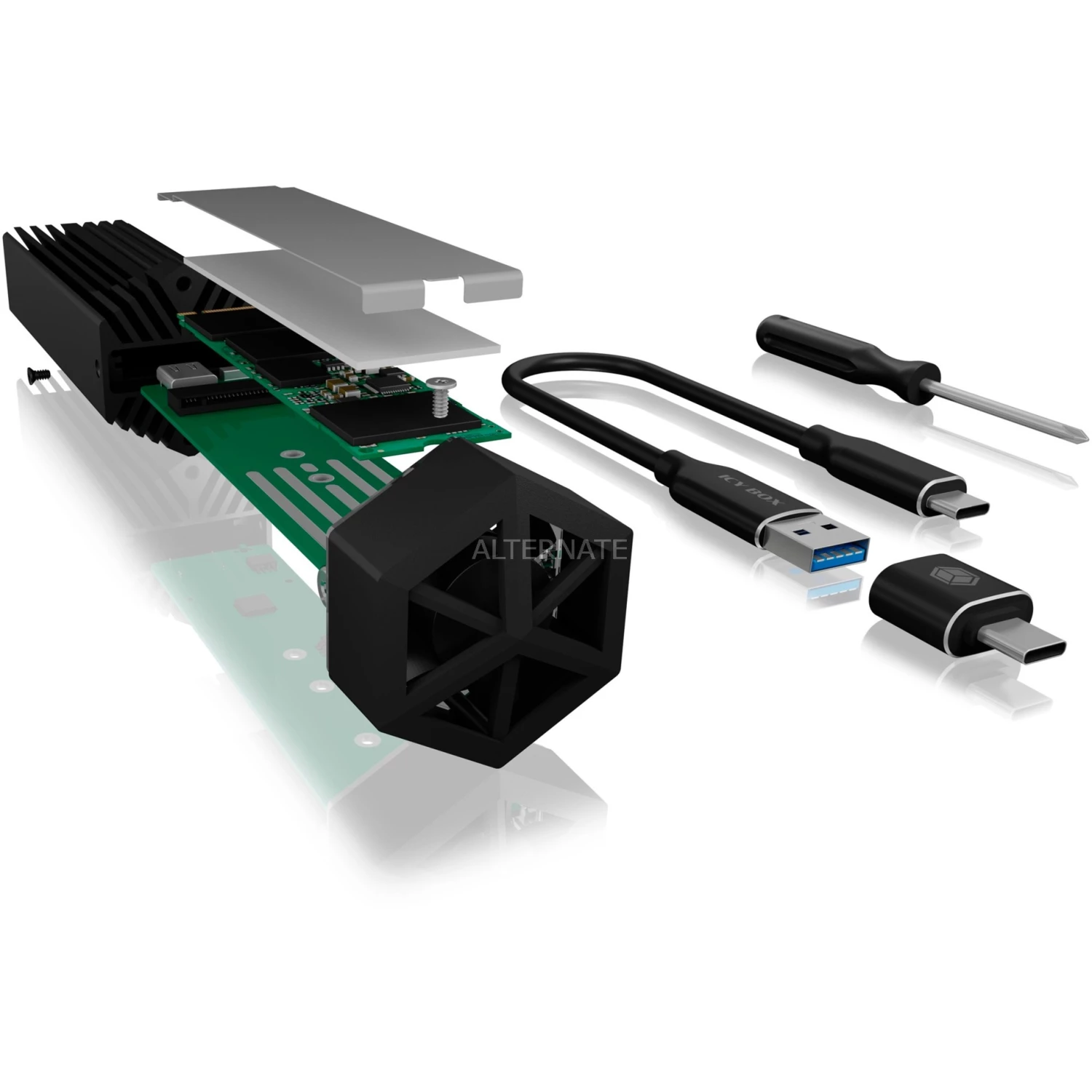 Mit dem IB-1823MF-C31 bringt man NVMe-Leistung und Style auf das nächste Level. Das Gehäuse verfügt über einen LED Ring mit fließend übergehender RGB Ambient-Beleuchtung. Ein PCIe-Controller verleiht der NVMe im Inneren des IB-1823MF-C31 rasante Geschwindigkeiten von bis zu 10 Gbit/s Lesen und Schreiben (abhängig von SSD Hersteller, SSD Modell und Version). Der integrierte 20-mm-Lüfter sorgt dabei für ausreichend Abkühlung und macht die M.2 SSD gleichzeitig langlebiger und effizienter.